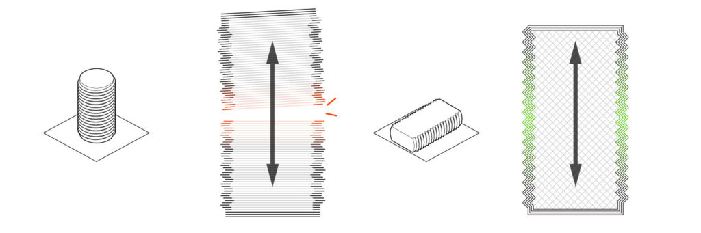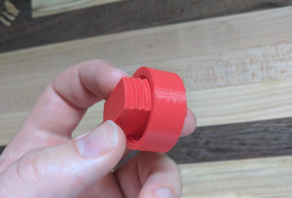 I wasn’t really sure what type of product I would use threaded parts for, but I knew that I wanted to incorporate a flat on the threads to print lengthwise on the bed. This makes each layer large, giving it the most possible surface contact between layers The part also can’t be pulled apart by the tension caused by tightening a nut, because the shell is continuous lengthwise down the threads.