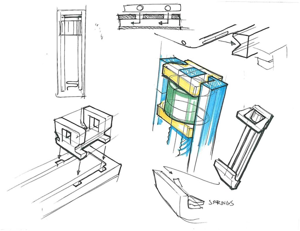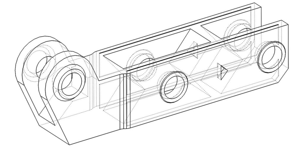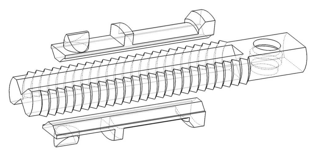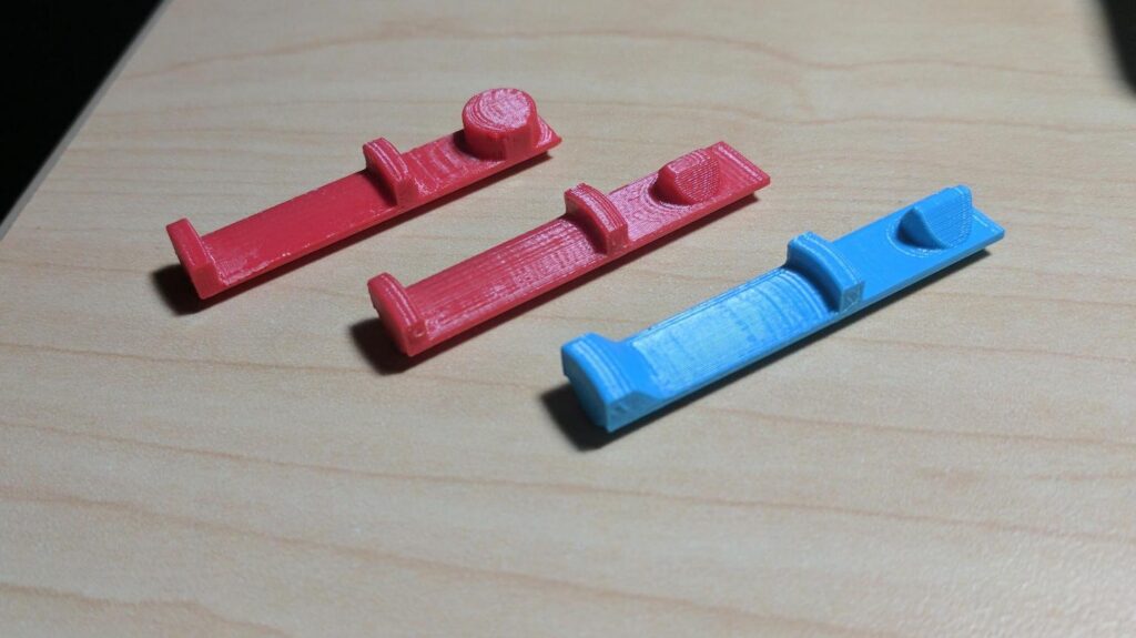 The threaded rods print on on their side on the build plate. This is a much stronger orientation because the grain of the plastic shells is much longer and you don’t have to rely as much on how well the layers are fused together. Removing parts of the thread didn’t compromise their function and allowed me to place a track for a sliding hinge.
