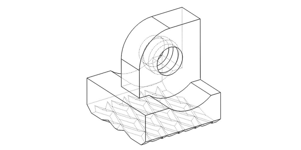 The jaws have a vertical slot cut into them to increase the shells of the part, creating more “grain” that runs along the part. One of the jaws sticks out more, because that is where the sliding hinges mount. The arrows on the side of the jaw indicates which way to turn the knob to expand or compress that part of the jaw.