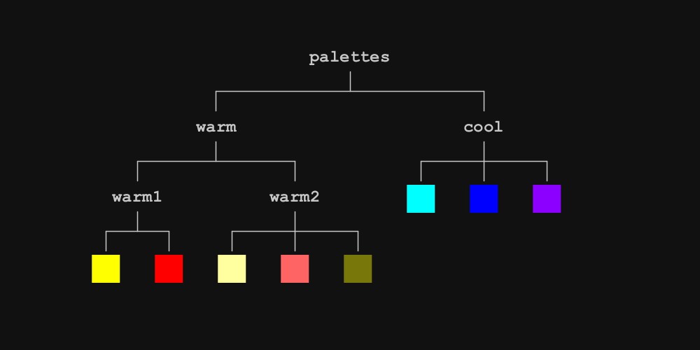 Here you can see a tree being used to store color palettes. Data can be stored in nested groupings with labels for easy organization. By accessing the leaves of any node you can easily query different groupings of colors. You could pick from a specific palette, or just a “warm” color, or by choosing a random leaf from the root node, you could get a random color from all palettes.
