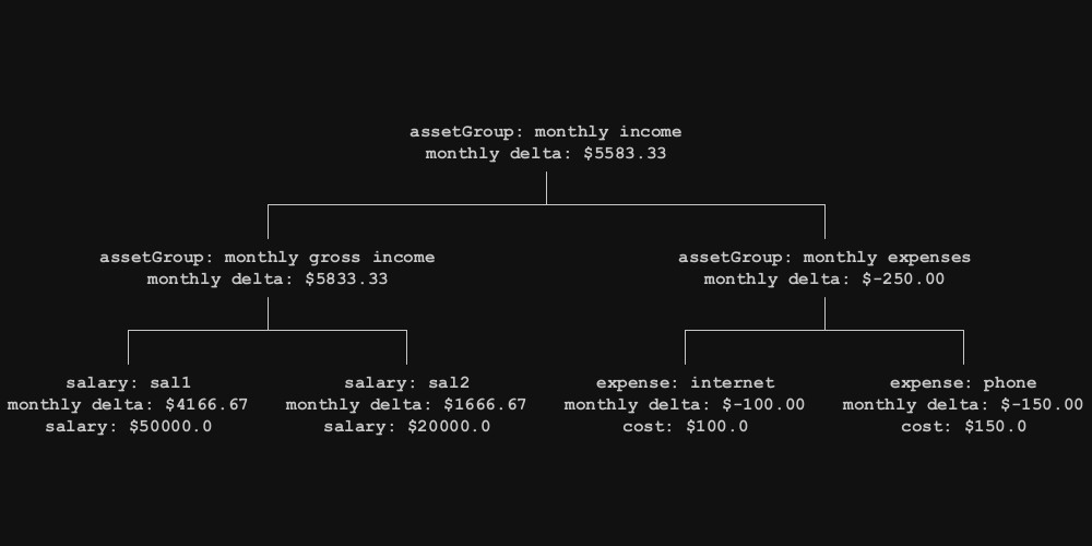 The example uses a MoneyObject base class which is subclassed into assetGroup for non leaf nodes, and Expense, and Salary for leaf nodes. All nodes have a monthlyDelta method, defined in the base class. This method allows nodes to calculate the value across the tree, while each node has different ways of calculating this value, along with unique fields and methods.