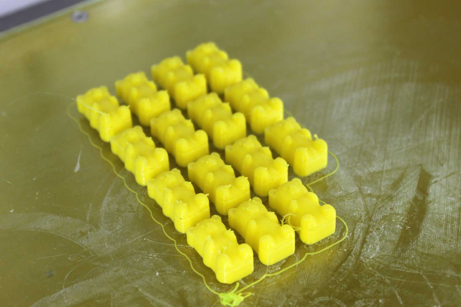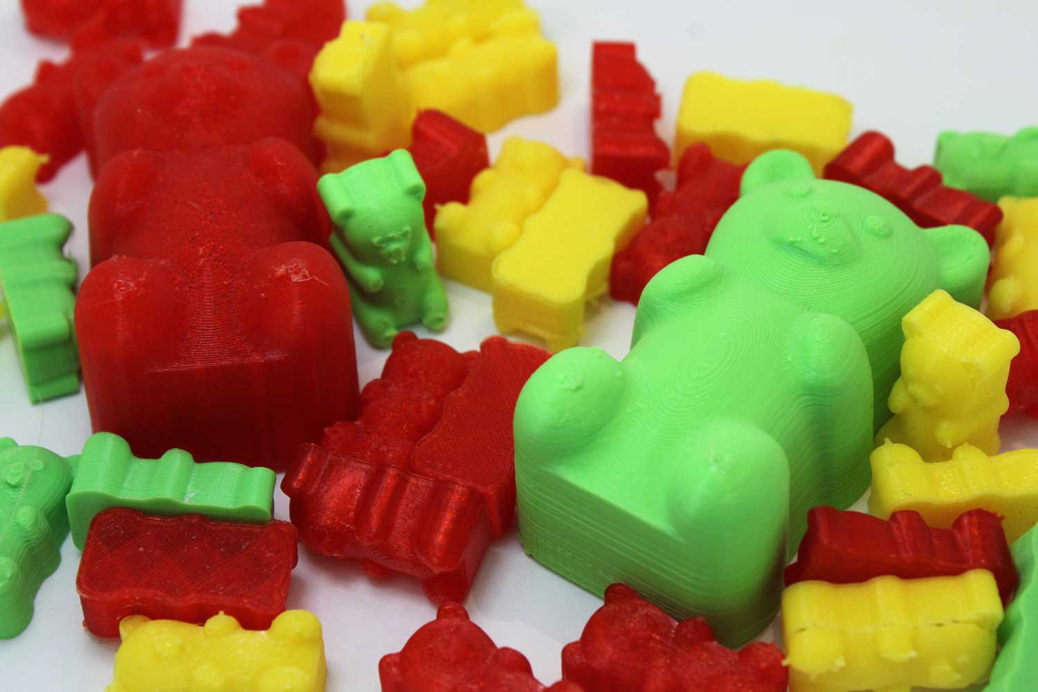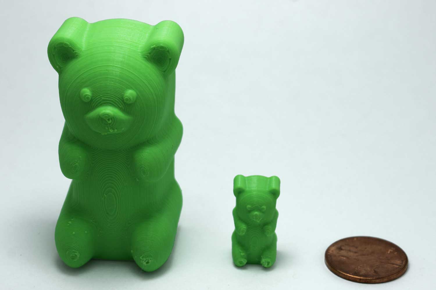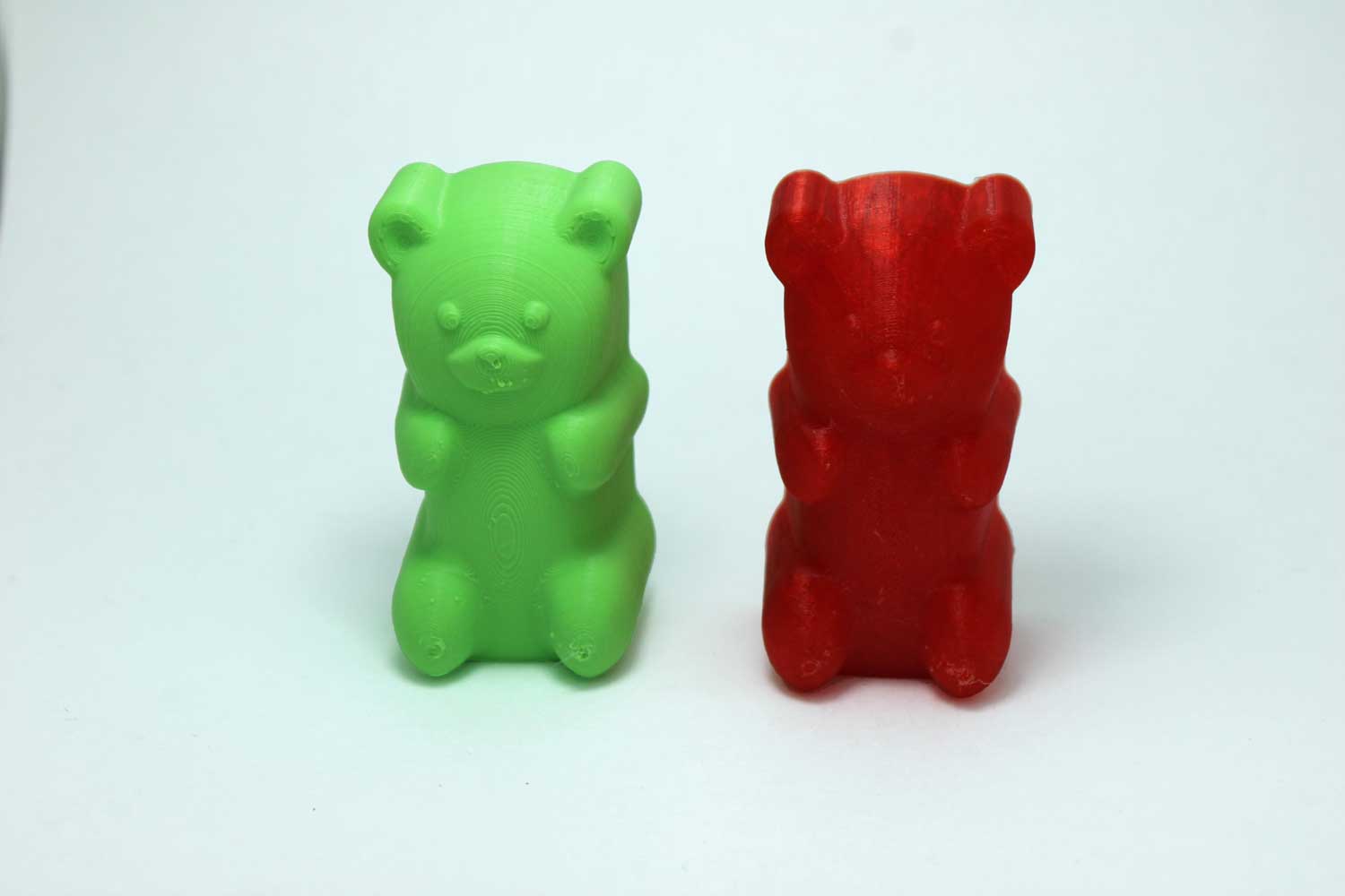 Gummy bear model prints pretty easily, stands upright. It was modeled after a desk toy I had. It can be printed on its back or upright and there is an actual size and larger 2″ model included.