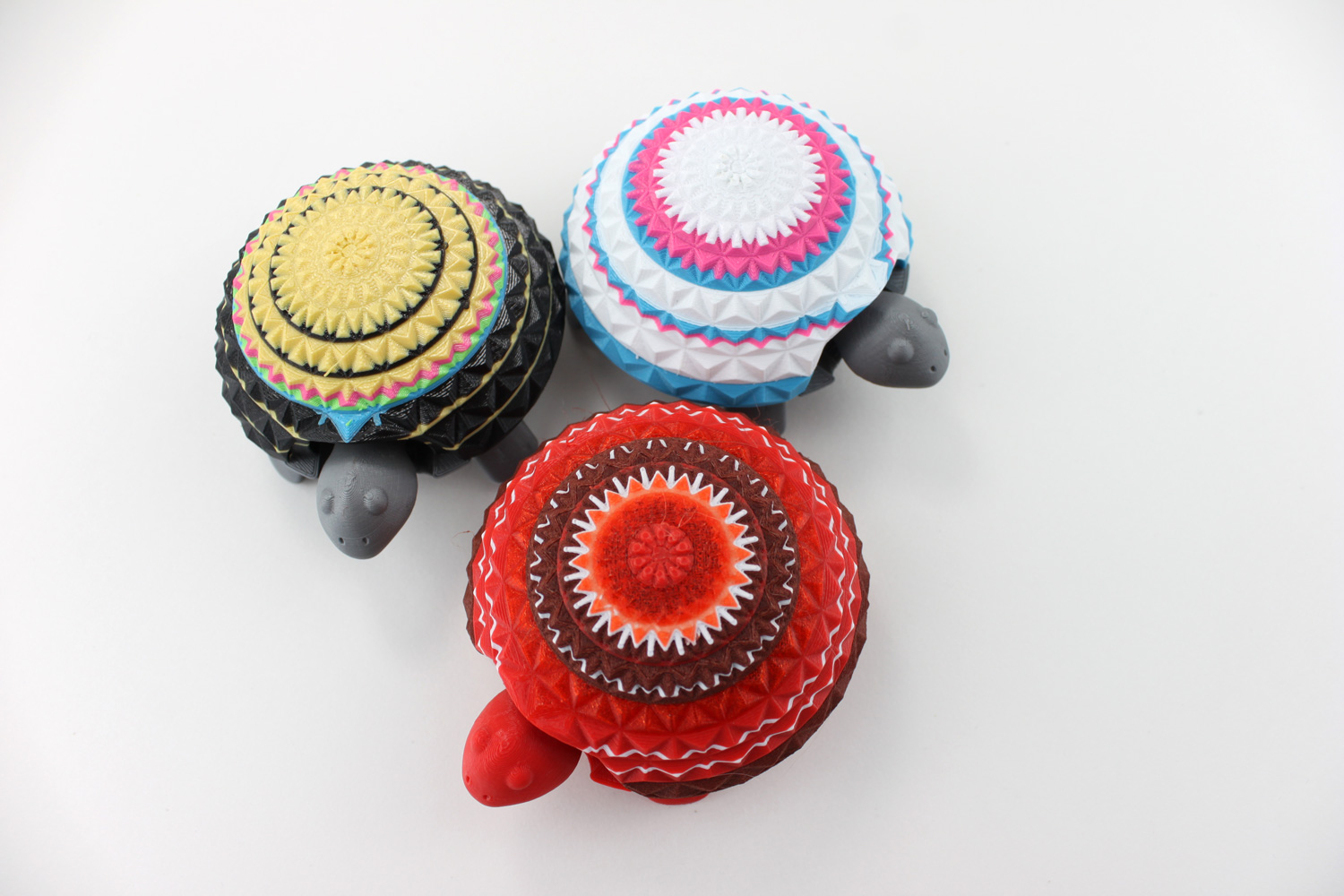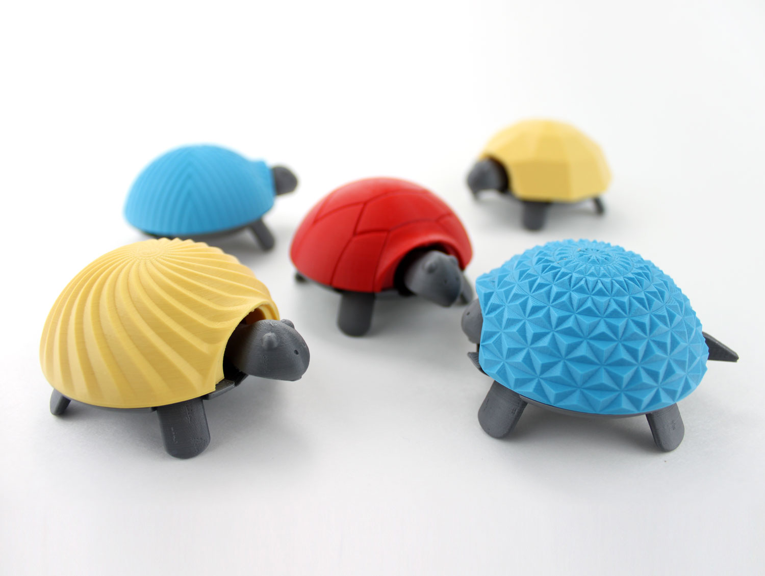This 3d printed turtle uses the same flex concept from my Mini Monster Truck to create legs that allow the toy to bounce and scurry around when tapped. The head can also retract into the shell.