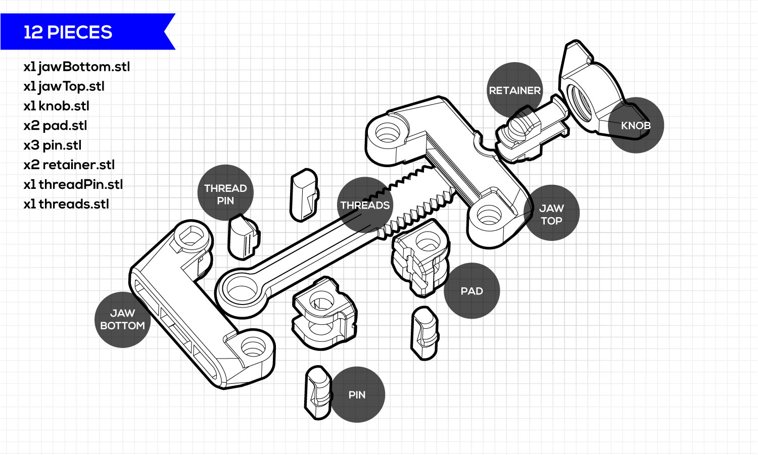 This thread clamp is fully 3d printable with no supports, glue, or cleanup. Check out the videos for assembly instructions and a clamping demo.